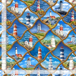 Lighthouse in Diamond Rope is part of the Beacon of Light collection by Timeless Treasures. This striking fabric features a diamond lattice of rope, with nautical scenes in each diamond, including lighthouses against the sky or the sea. The repeated pattern combines classic coastal motifs with a structured design, perfect for creating nautical-themed quilting, home décor, and accessories.