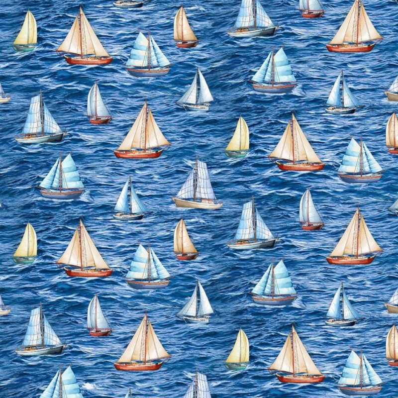 Sailboats in the Sea is part of the Beacon of Light collection by Timeless Treasures. This charming fabric features various sailboats floating across a calm blue sea, each boat rendered in different designs and colours, creating a playful and scenic nautical theme. The print captures a serene, coastal atmosphere, making it ideal for quilting, accessories, and home décor.