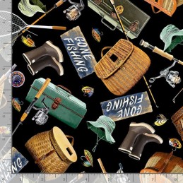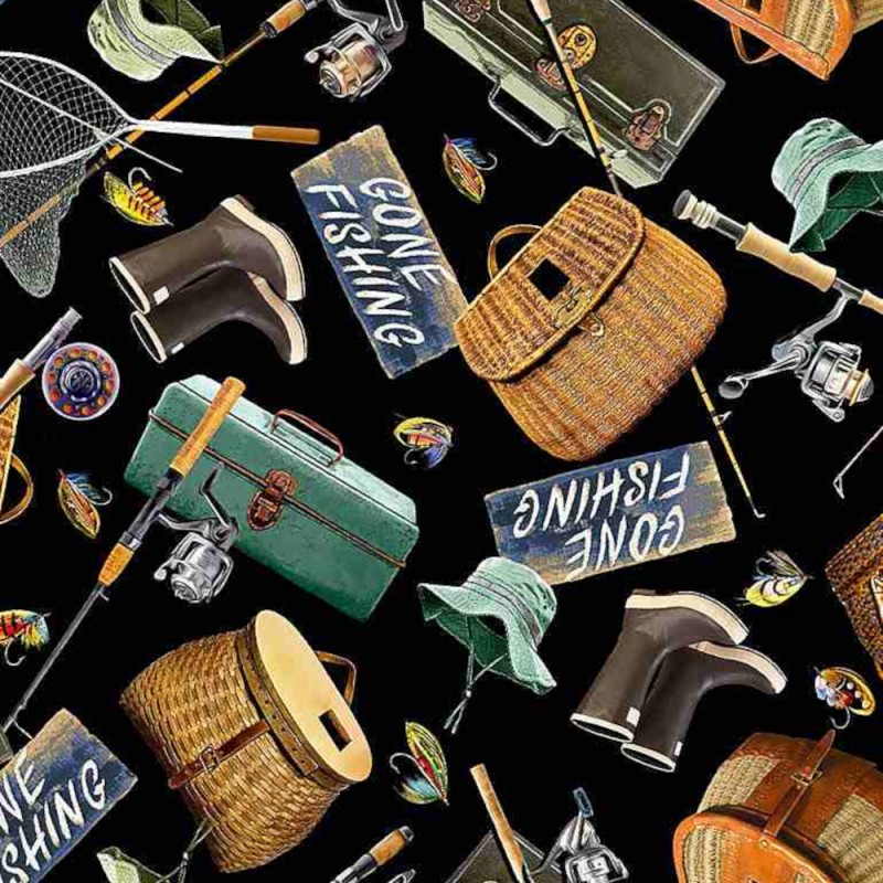 Fishing Gear is part of the Woodland Retreat collection by Timeless Treasures. This fabric features a dense, repeating digital print of fishing-themed items on a black background, including rods, reels, baskets, tackle boxes, boots, hats, “Gone Fishing” signs, and colourful lures. The vintage, illustrative style gives it a charming, nostalgic feel, perfect for quilting, accessories, home décor, and creative sewing projects.