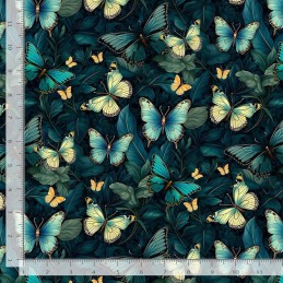 Midnight Butterflies is part of the Forest Whisper collection by Timeless Treasures. This digital cotton fabric features a dense nature-inspired print of butterflies in blue, teal, and yellow tones, set against layered dark green foliage. The soft watercolour-style detailing gives the fabric a rich, artistic depth, ideal for creative projects that need a touch of elegance.