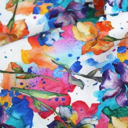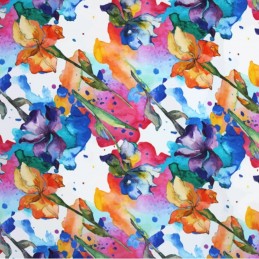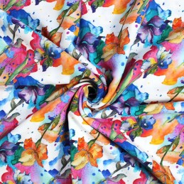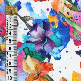 Watercolour Flowers – Bedford by Little Johnny is a striking and expressive viscose fabric that celebrates colour, movement, and painterly style. This abstract floral design features iris flowers in a vivid palette of orange, yellow, pink, blue, purple, and teal, all rendered in a loose, watercolour technique that highlights visible brushstrokes and organic flow.