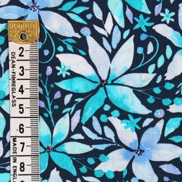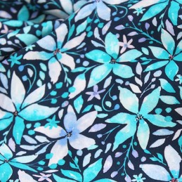 Flowers – Connaught Terrace by Little Johnny is a beautifully detailed, artistic floral viscose fabric, featuring a delicate arrangement of poinsettias and soft foliage with a painterly touch. The main poinsettia blooms are depicted in gentle shades of turquoise and light teal, with soft white highlights that evoke a watercolour aesthetic.
