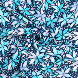 All of this plays out against a rich navy blue background, which offers bold contrast and gives the lighter elements an elegant lift. The result is a soft, airy fabric with rich detail—perfect for blouses, dresses, skirts, and summer wear where comfort and visual charm meet.