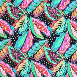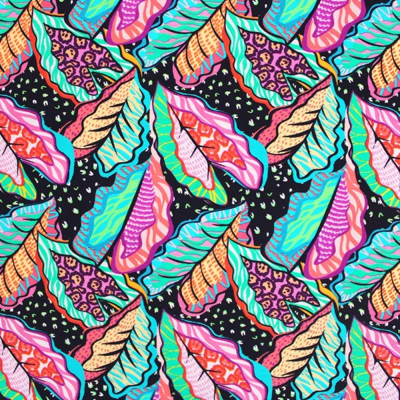 Graphic Leaves by Little Johnny is a bold and vibrant viscose fabric featuring an all-over design of stylised leaves in bright shades of pink, orange, turquoise, green and yellow. Each leaf contains unique internal patterns, from zebra-like stripes to leopard-style spots, all layered over a black background dotted with irregular white specks. The layout is dense and energetic, making this fabric visually striking and full of personality.