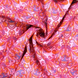 The pattern is a whimsical print featuring complex swirling shapes, offering visual interest without overwhelming the eye. This fabric lends itself particularly well to summer dresses, flowing blouses, layering garments, scarves, or even craft and accessory projects that call for softness and movement.