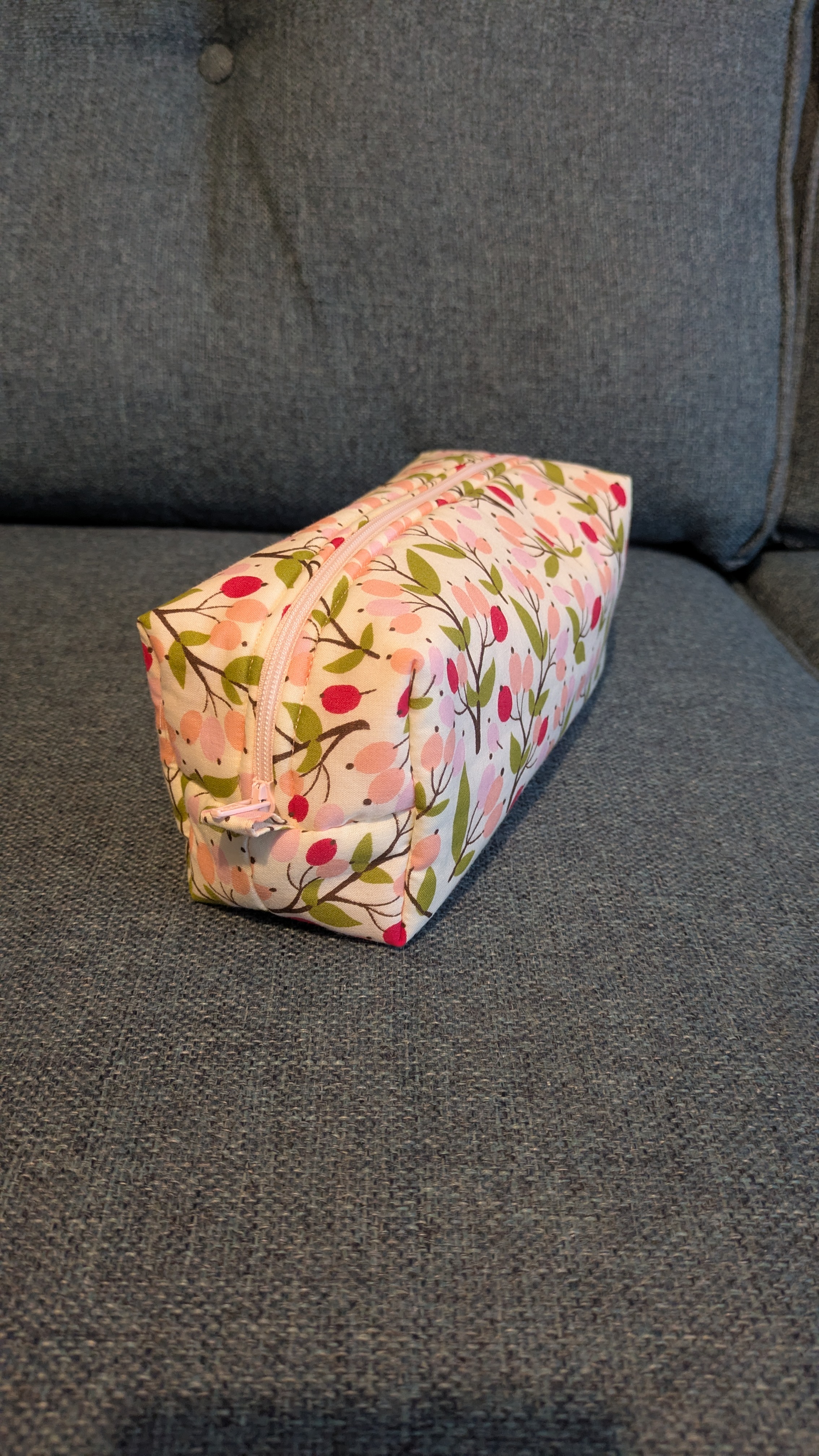 Material is amazing, beautiful pattern and great quality. Excellent for making this boxy pouch. Fusible fleece was really easy to use and gave great structure for the bag!